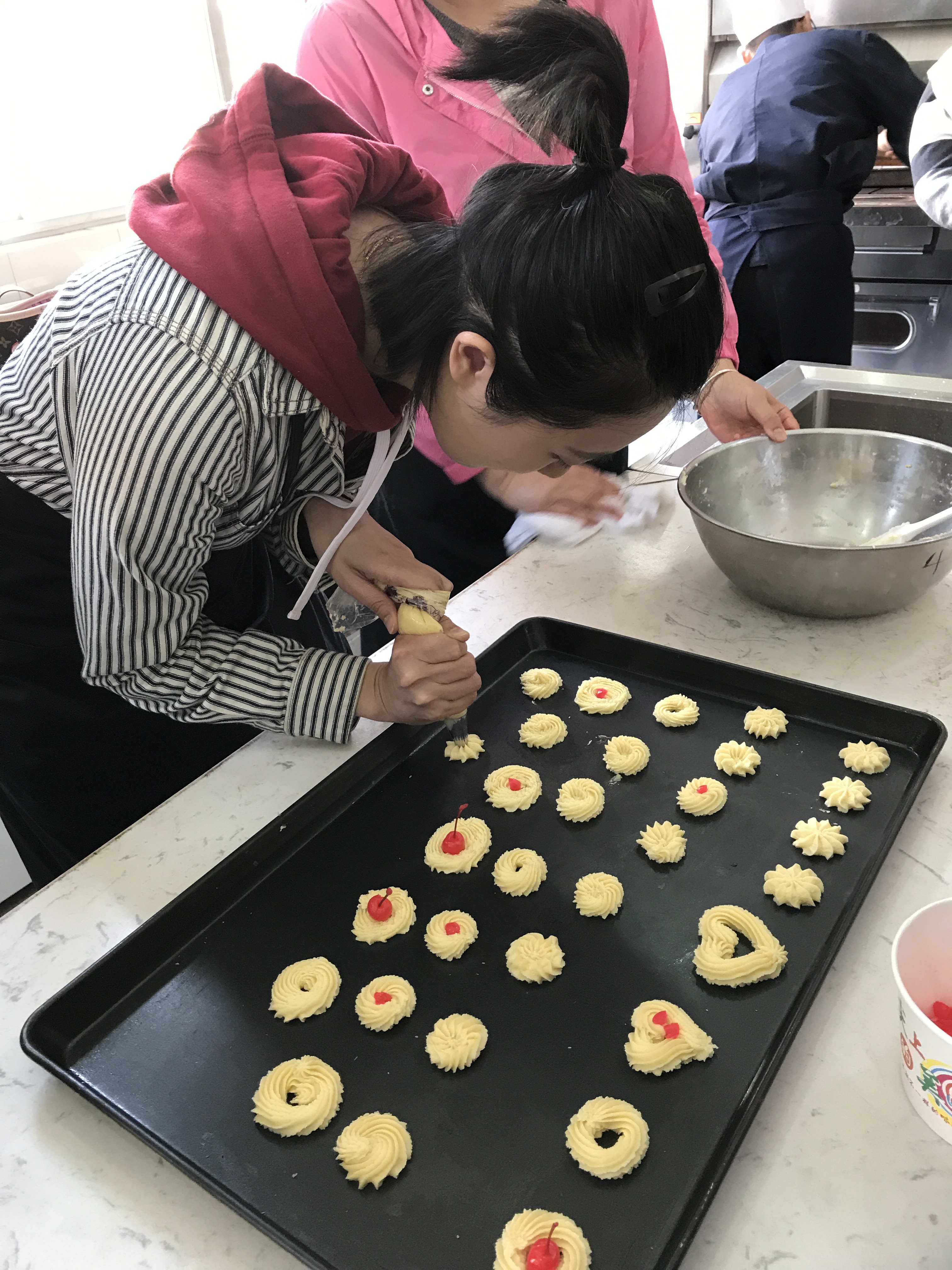 体验活动分为西点烘焙和川菜制作两项,让我们用镜头引领着大家先去西点烘焙体验现场。教职工们围成一圈,专心致志地听西点师傅传授诀窍。有的老师用笔记录制作要点,有的老师直接用手机录下视频,大家目不转睛,跃跃欲试,认真与兴奋之情溢于言表。饼干的定型过程可谓是一番技术活,在老师们的奇思妙想下,心形,圆型,波浪形饼干纷纷出炉,甚至出现了学校的swufe标志,大家的爱校之心在任何时候都不忘体现。不多久,热腾腾的糕点新鲜出炉,西点教室里奶香四溢。