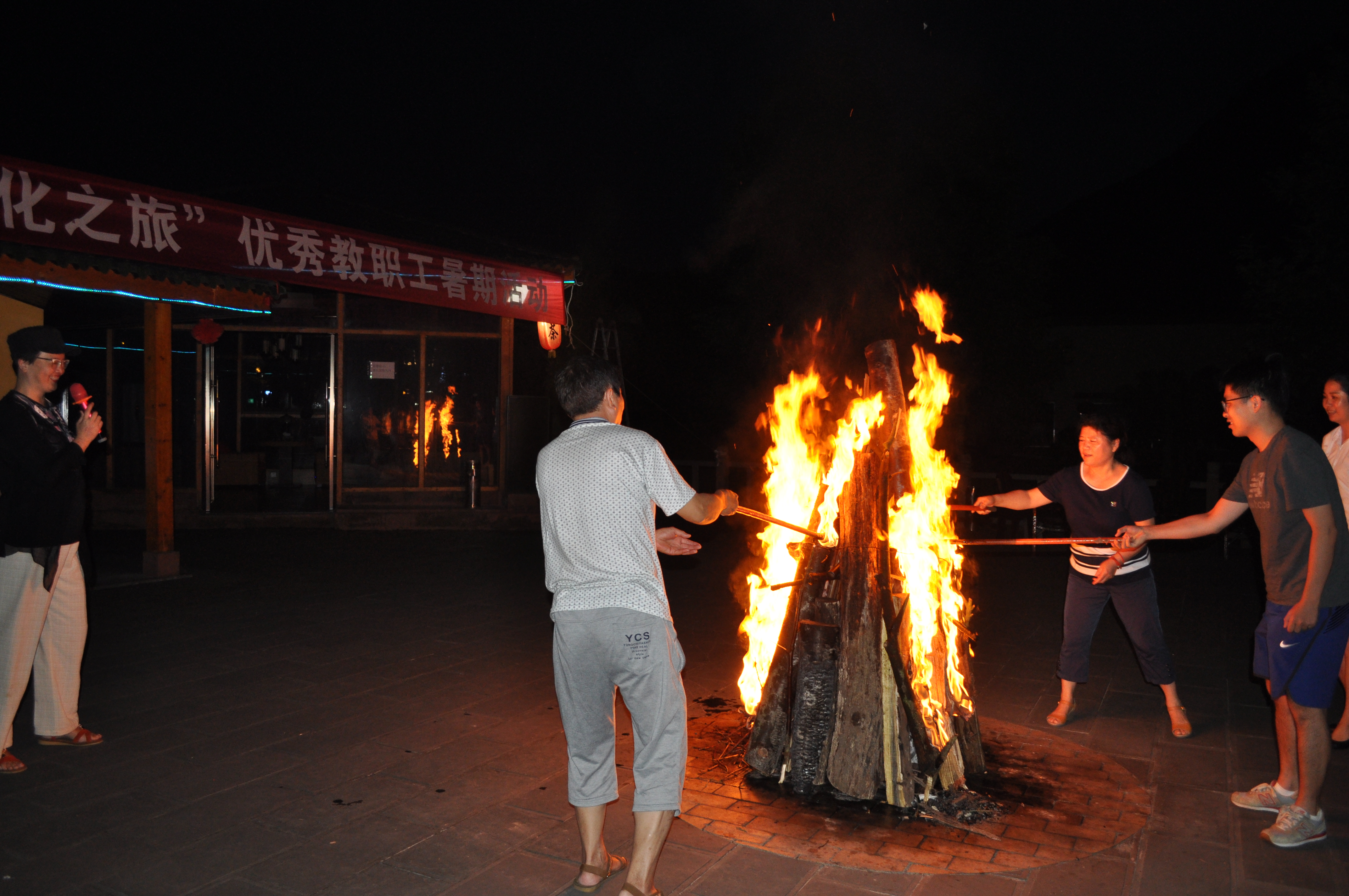 这次的活动将优秀教职工的休养与民俗文化的体验学习相结合,将文化自信的教育纳入了教职工的休假活动中。到达当晚,全体先进教职工参加了热闹且极具民族风情的篝火晚会。晚会由公共管理学院分党委书记章群主持,老师们踊跃展示个人风采,贡献了绕口令、歌曲演唱、藏舞等精彩纷呈的节目。由老中青教师代表一同手执火把,点燃熊熊篝火,寓意着学校的“双一流”建设在教职工心中燃起的凝心聚力、热情迸发之火。
